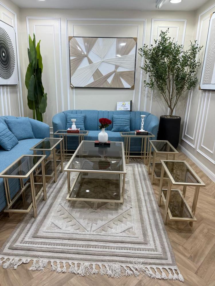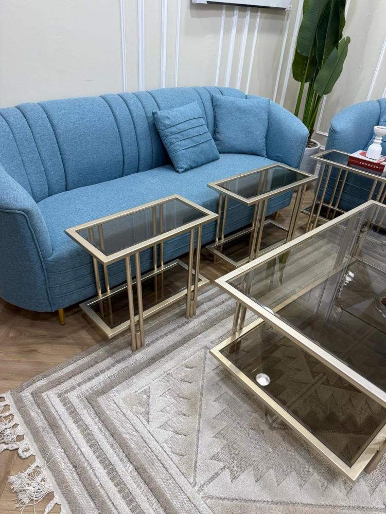 الطاولات مزودة بأسطح زجاجية شفافة مع إطارات معدنية باللون تضيف مظهرًا عصريًا ومتناسقًا.